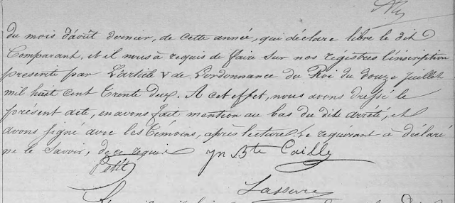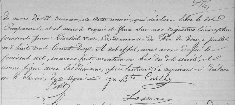 L’an mil huit cent quarante deux et le lundi cinquième jour du mois de septembre, à huit heures du matin, par devant nous Vincent Lasserre, maire officier de l’état civil de la Commune des Saintes, dépendances de la Guadeloupe, est comparu le sieur Chaleau Jean Charles, âgé de cinquante six ans, charpentier, né est domicilié en cette île, le quel assisté des sieurs Jean Baptiste Caille, âgé de quarante six ans, et Paul Désiré Petit, âgé de trente ans, tous deux propriétaires et domiciliés en cette commune, nous à présenté l’extrait de l’arrêté de Monsieur gouverneur, en date de vingt six du mois d’août dernier, de cette année, qui déclare libre le dit comparant, et il nous à requis de faire sur nos registres l’inscription présente pour l’article V de L’ordonnance de Rois du douze juillet mil huit cent trente deux. A cet effet, nous avons arrêté, et avons signé avec les témoins après lecture. Le requérant a déclaré ne le savoir, de ce requis.