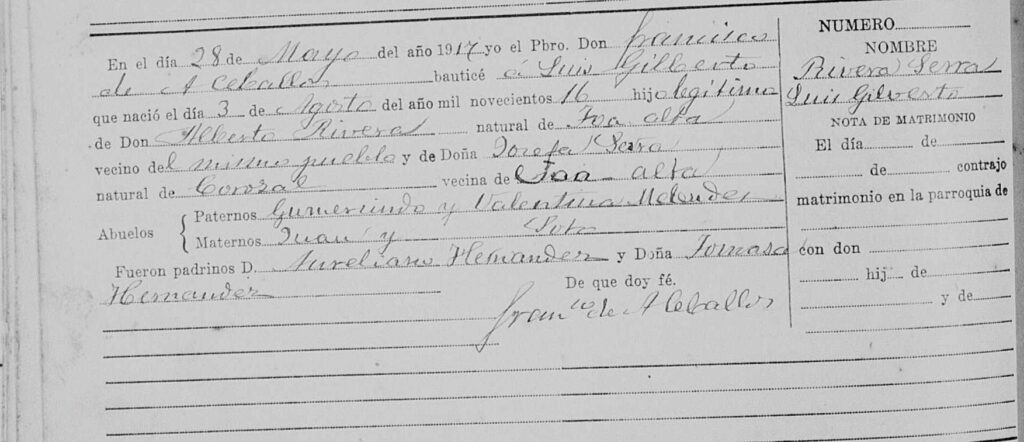 So let’s take a look at the certificate for my 2nd cousin, 2 times removed – Gilberto Rivera Serra.