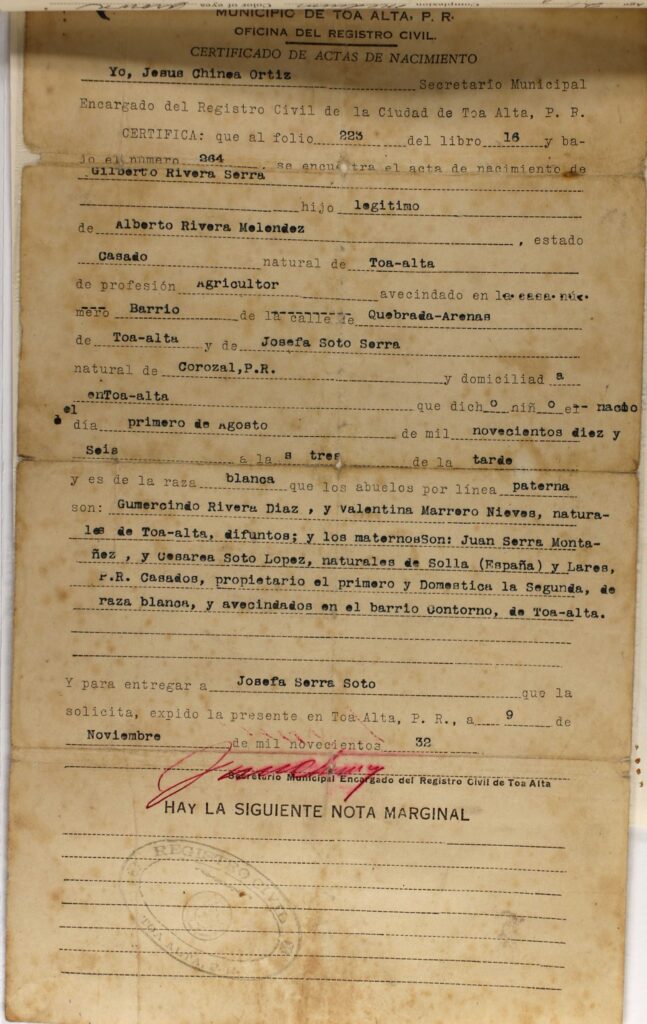 A baptism record for Gilberto Rivera was also located in the parish of San Fernando in Toa Alta, Puerto Rico, confirming the information found on his birth record. Here, Gilberto was listed as Luis Gilberto Rivera who was born on 3 August 1917. It is important to note that he was baptized nine months after he was born.