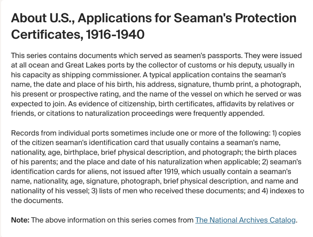 Today, I want to focus on another resource that can include your Puerto Rican ancestors. This record set is known as the “applications for seaman’s protection certificate”.