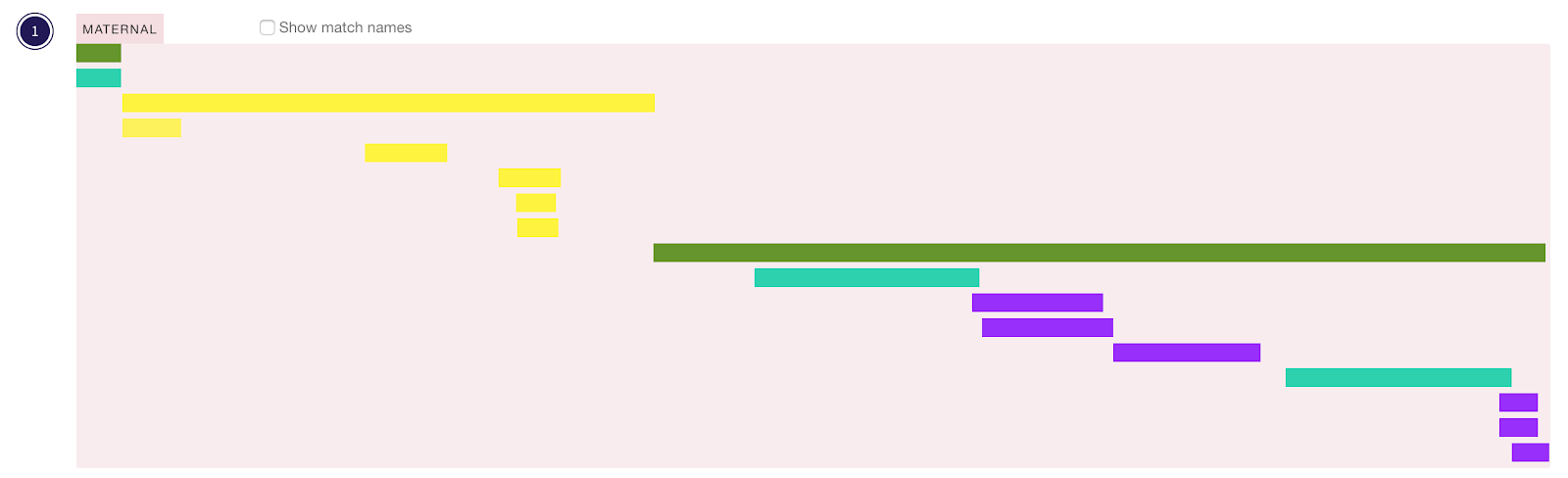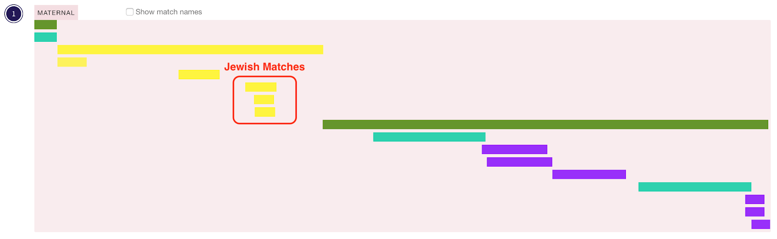 This view of my maternal chromosome 1 is an expanded view of the different matches I have, as you can see I have turned off the “show match names” to provide anonymity. However based off the colors you can notice a few things.