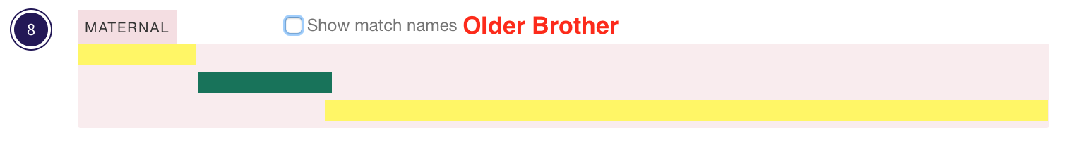 The box will look something like this! Depending on how many times you match that person across various segments you can continue to pile on the segments on new lines in the same box. Once you have placed the segments and are ready to save the match, you can decide what color to save the match and what name they can go under. For example, I chose to use my grandfather’s name and so anytime I match someone through him they go under the color yellow and attached to his name. For me, this allows me to see the matches that I have through him.