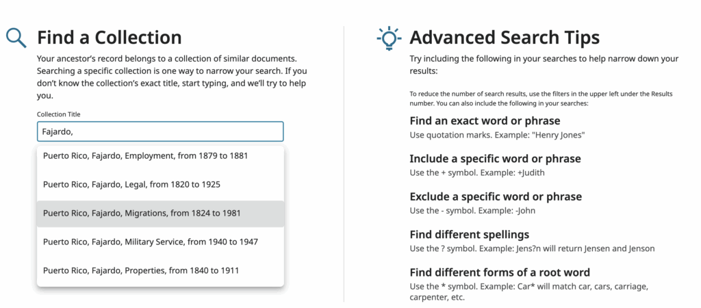 If you notice above, by searching for collections related to “Fajardo”, you can see that many of the collections listed are not your typical church or civil records that we as genealogists use for our Puerto Rican searches. There are records listed that are tied to employment, migration, properties, and even legal documents. I did not mention the military service documents because many of these are simply the World War II draft registration cards that you can already find on FamilySearch and Ancestry.