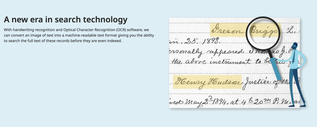 Full Text Search uses handwriting recognition and OCR (Optical Character Recognition) which can convert handwriting into machine readable text (FamilySearch). This means that it can take tons of documents and turn them into indexed searches – cutting out the time needed to read these documents. This is especially important for documents that do not follow a template but may contain important information regarding an ancestor. For example, a deed or probate record may include your ancestor’s name somewhere on the document; however, if you do not read the entire document you might not be able to find or recognize that your ancestor is listed in the document. This technology can also be helpful for documents that are lists that are pages long, allowing you to quickly search the document through an indexed search without having to read each individual name. In short, it saves a ton of time!