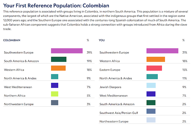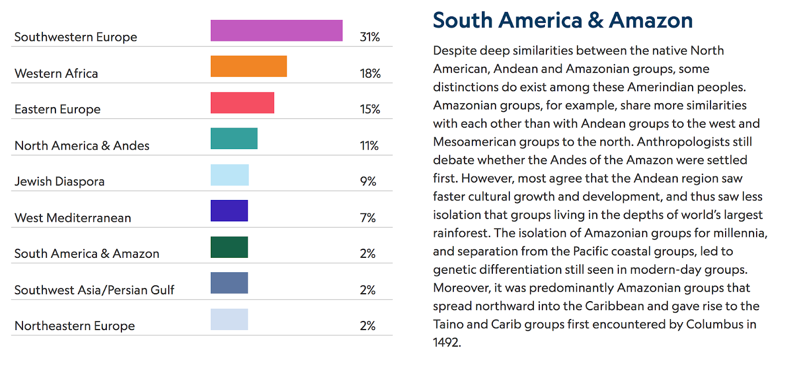 Most of the results match what I have seen on other sites, with a few variations here and there. For example, “Eastern Europe” is at 15% and “Jewish Diaspora” at 9% which I think is the highest I’ve seen it on any site. What’s cool is that each region provides an explanation as well. I’ve screen shotted some of the explanations, check them out! I’ve provided some for “Western Africa”, “Jewish Diaspora”, “Eastern Europe”, “South America & Amazon”, and “North America & Andes”.