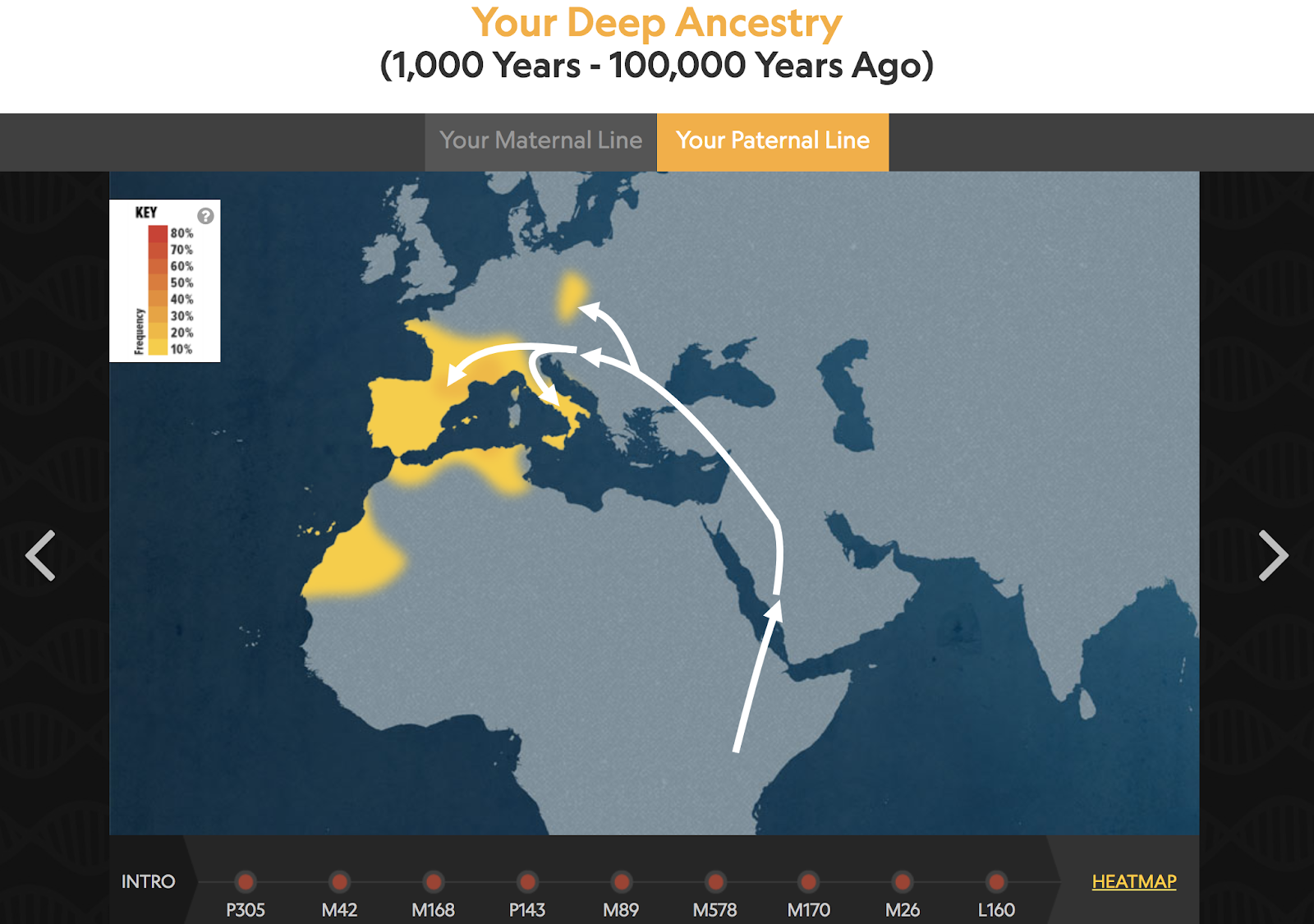 Lastly, there is the deep ancestry part which is basically the paternal and maternal haplogroups. As you saw above these two groups for me are C1b4 (Maternal), and I-F1295 (Paternal). This is the first time I’ve gotten a deeper “subclade” (if you can call it that) of my paternal haplogroup. For many years I knew it only as 12a1* and recently on 23andme it has gone to I-M26, I imagine I-F1295 is the same but I will have to do some more research into this group. There is also an explanation of the group provided, a timeline throughout the years to its current grouping, and a heat map of where it can be found around the world today. Interestingly enough my paternal haplogroup still seems to be under investigation as it hasn’t really been directly pinpointed geographically as my maternal haplogroup. It is however good to see that it can be found in Portugal and Spain which is where I would imagine it to go back to due to my ancestry.