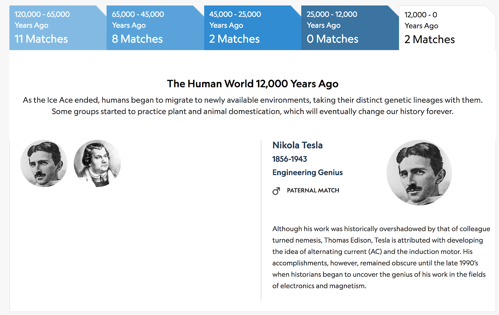This feature is actually pretty cool because I haven’t really come across it on other DNA websites, 23andme had a version of this but dunno where it is now… haven’t seen it on the haplogroups part of the website in a while. Though it’s cool to look at and explore, it doesn’t really hold much genealogical value. Most of these people are probably related through off branches of your haplogroup and as you can see the ranges of years are pretty high. Nonetheless, it was a cool first thing to see when I logged into Geno 2.0. Here are two of my matches, Nikola Tesla and Martin Luther!