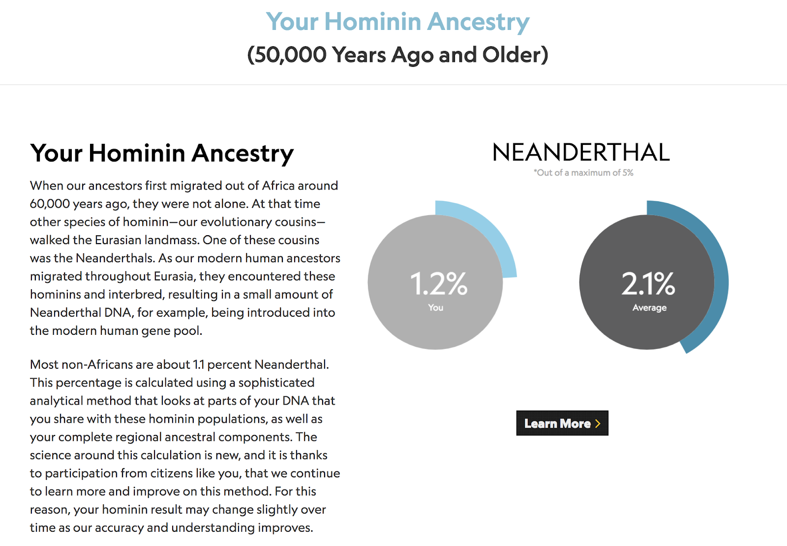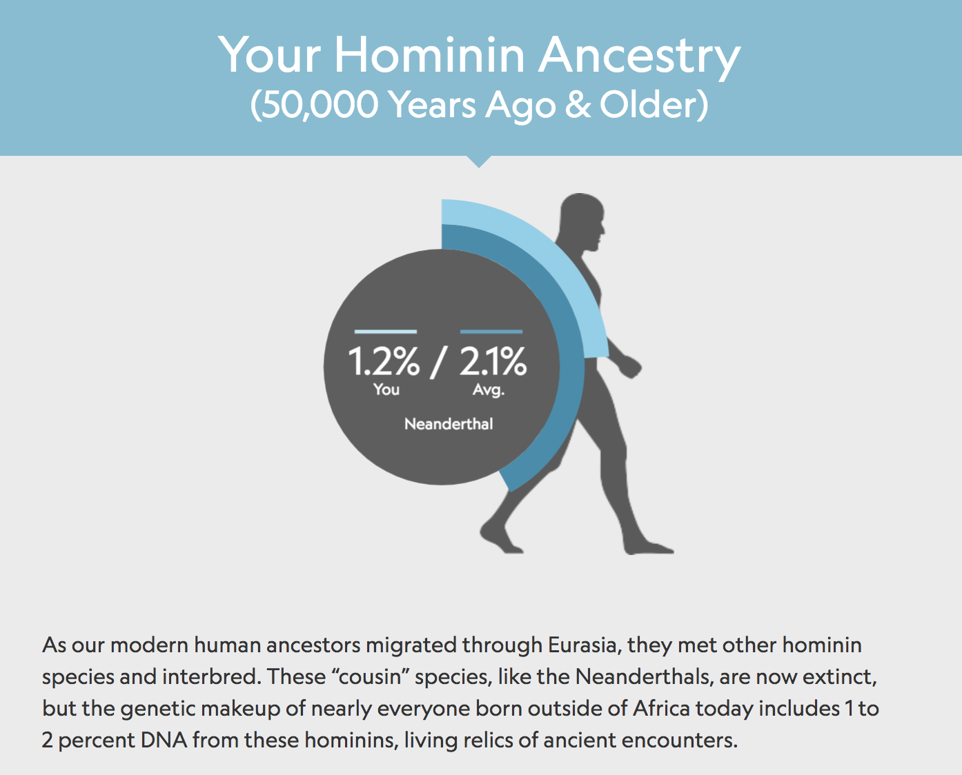 This is another feature that’s cool to look at but again, to me, it doesn’t hold much genealogical value. As you can see below I score a 1.2% on my Neanderthal ancestry, which is a tiny bit lower than the average which is 2.1%. Truth be told, I didn’t really explore this much but again, just posting it here because it’s part of the analysis.