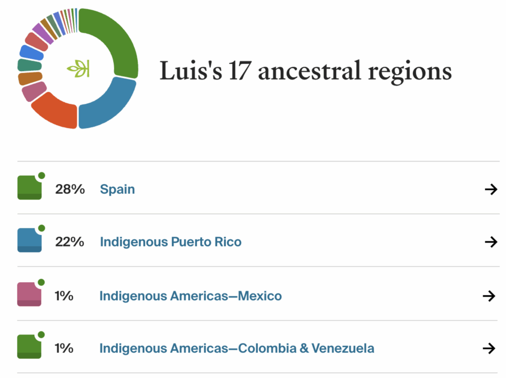 My 23andMe on the other hands shows that I have 13.4% DNA from Indigenous America – specifically from Puerto Rico. This number has always been fairly steady since I took my 23andMe DNA test back in 2010. The number has fluctuated a bit, of course, however I trust this number much more since having 25% Indigenous DNA feels like a lot, especially since I have not had new Taíno DNA brought into my family likely since at least the 1500-1600s. That is to say that I do not have a full-blooded Taíno ancestor who entered my family in recent years as would a Spanish or African ancestor.