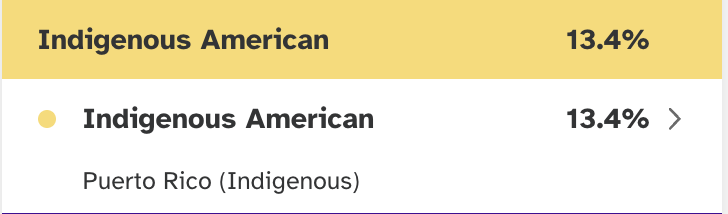 One of the most important ways of knowing if you have indigenous ancestry is DNA evidence. It is important to keep in mind that many DNA tests provide estimates of your percentages inherited from your ancestors. This means that numbers will fluctuate as the science becomes more accurate and/so more samples are added. If you have tested with 23andMe and AncestryDNA, you will notice that the numbers are usually not the same (though they can be close). For example, on AncestryDNA I have 22% Indigenous Puerto Rico DNA as well as 2% Indigenous DNA from México and Colombia & Venezuela. It is very possible that these smaller 1% chunks are being misread and should be lumped in with my Indigenous Puerto Rico DNA, but again, for now this is what my DNA is showing.