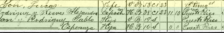 Interestingly enough Lucas seems to have integrated himself fairly quickly seeing as how by 1910 he was married with a Puerto Rico women and having already 11 children with her! Lucas Yon had married Alejandra Rodríguez Nieves, a native of Puerto Rico around 1887 and produced many children: Pablo, Esperanza, Aleja, Lucia, Angela, Diomedes, Lucas, Rafael, José (living with their parents in 1910). Lucas is said to have arrived on the island in 1880 therefore missing the window of the Cedula de Gracias which brought many foreigners to the island. By 1920 Lucas had moved on to a second relationship with a woman named María Ortiz and they are “CC” which means they aren’t married through the church. They have four children by the 1920 Census: María, Josefina, Salvador, and Estel. As you can see, Lucas Yon had many children!
