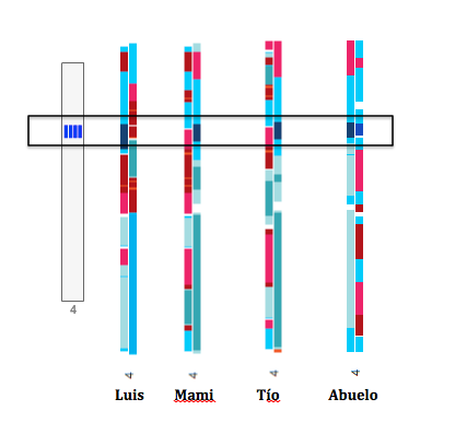 Here I decided to show it a bit differently by organizing the bars vertically and creating a rectangle horizontally where the Ashkenazi piece is. You can see that my piece of Ashkenazi is a bit longer than my mother’s or even grandfather’s yet we all inherited that piece on the same spot on Chromosome 4.
