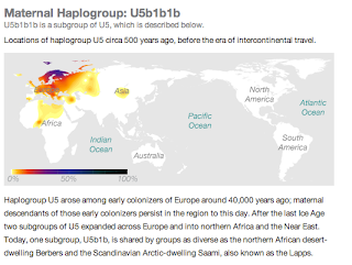 U5b1b1b is part of the branch U5 which “arose among early colonizers of Europe around 40,000 years ago”. But what’s more interesting about this group is that is seems to have made its way back into Africa via Northern Africa where it can be found amongst people in Morocco and even as far south as Senegal. The big question for me is: Where did my U5b1b1b ancestress come from herself? Did she live in southern Spain before heading off to Puerto Rico? Was she a Moroccan woman who’s family found their way to Spain and settled in Al-Andalus? Or was she just a European woman who’s husband decided to head to the Caribbean and she agreed to the journey?
