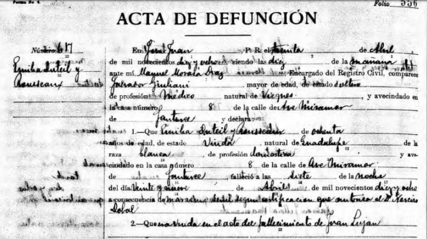 Emilia would die in Santurce, living in Miramar on the 29th of April 1918. Here was listed as Emilia Duteil Rosseaux, widowed of Juan Lujan and the daughter of Juan A. Duteil and Adela Rousseaux. The person who came forward to report her death was Salvador Giuliani, listed as sobrino or nephew of the deceased.