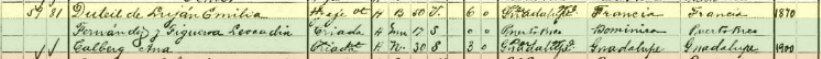 Emilia Duteil first appears on the 1910 Census living in Vieques, Puerto Rico, widowed and says that 6 children were born but 0 are alive at the time of the census. It says her birthplace is Guadeloupe while her parents are listed as “France”, and says that Emilia immigrated in 1870. Interestingly enough the it says she is white which I haven’t seen too many of since many are mixed, mulatto, or black. Emilia was living in the 1910 census with two “criadas” one being a servant and the other a cook, Leocadia was listed as mulatto while Ana Colberg who was also from Guadeloupe was listed as “N” for negra.
