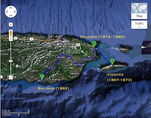 Here’s a image I made from Google maps showing them hopping around Puerto Rico from Vieques, to Fajardo, to Salinas with years attached showing when they were living in those towns. Martina Isabel was born in Santa Isabel for whatever reason but the family lived for the most part in Salinas before spreading out along the southern coast.