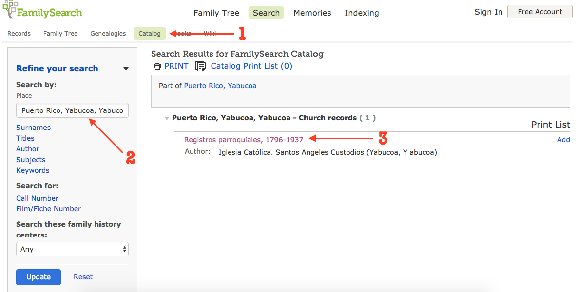 In order to find these records you have to enter the “Catalog” tab on the FamilySearch website. From there, you will find on the left hand corner the “place” tab. If you enter a town for example like “Yabucoa” you will notice there will be two mentions. One is “Puerto Rico, Yabucoa” and the other is “Puerto Rico, Yabucoa, Yabucoa”. The former is the link to the Puerto Rican Civil Registry while the latter is the link to the Puerto Rican Catholic Church records. When you click on the second one you will be taken to another page. Notice that not all churches will appear for all towns in Puerto Rico, there are some towns that refused to be microfilmed which fell under the decision of the Archdiocese of that section. So towns like San Sebastián, Mayagüez, Añasco, Quebradillas, etc. will not appear here because the LDS church was not allowed to microfilm their church records.