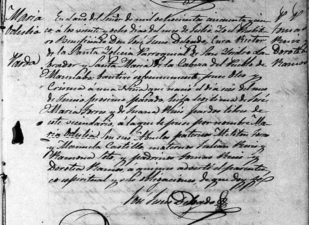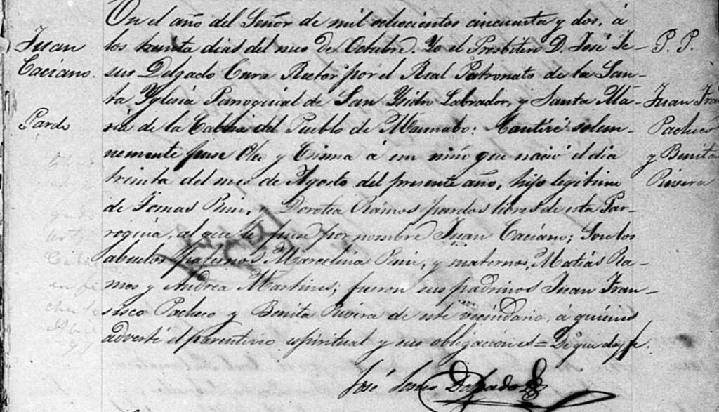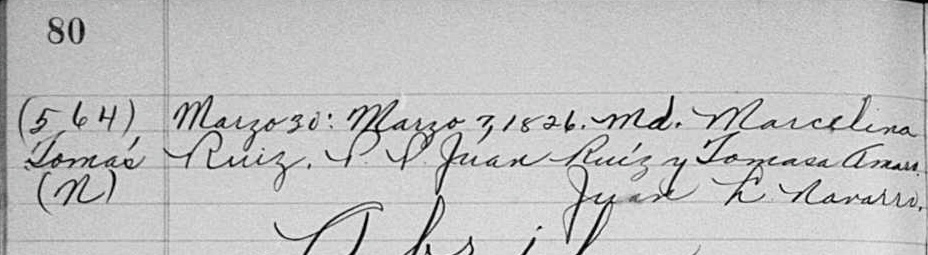 With this information, this means that Tomás and Manuel cannot be brothers as they do not share the same parents. Locating Tomás’s baptism record confirmed that he was the son of Marcelina Ruiz. Tomás was born on 7 March 1826 and baptized on 30 March 1826. His godparents were Juan Ruiz and Tomasa Amaro. Juan Ruiz shares the same surname as Tomás’s mother and future research may yield a relationship between them.