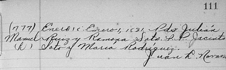 In his marriage, Manuel was listed as a native of Maunabo, and the legitimate son of Julián Ruiz, deceased, and Ramona Soto. A baptism was located in the Maunabo parish records that stated Manuel was born on 1 January 1831 and baptized on 18 January 1831. His parents were Julián Ruiz and Ramona Soto, and his godparents were Jacinto Soto and María Rodríguez. It is important to note that Manuel’s godfather’s surname was Soto – the same as his mother’s. Future research may yield a familial connection.