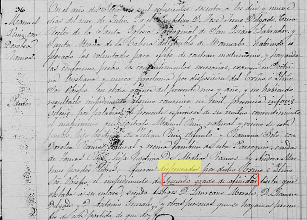 Looking at this marriage again, I noticed something that I had not noticed before when I first read this record (I was a novice when it came to consanguinity!). The record actually stated they had an “impedimento de segundo grado de afinidad lícita” meaning that Manuel and Dorotea were not related to each other; if not, Manuel and Dorotea’s first husband were related to each other. This made much more sense especially since both men were surnamed Ruiz and when I tried to find Dorotea’s connection to Manuel the first time around I was unable to.