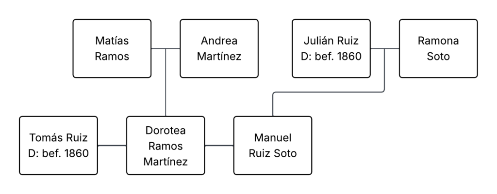 Below is a simple family tree showing Dorotea’s and Manuel’s parents’ name as well as Dorotea’s first marriage to Tomás Ruiz.