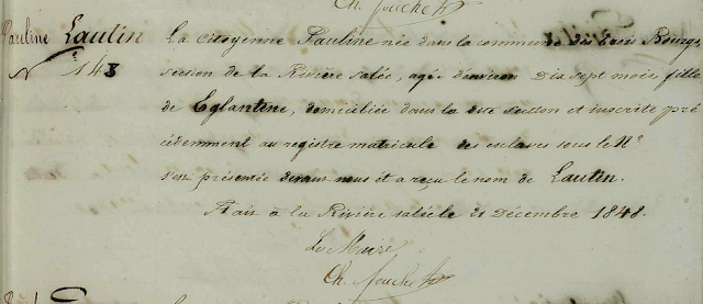 For the non-French speakers/readers out there basically these documents are just stating that these three women were coming forth to register themselves, rather Eglantine was registering herself and her daughters. Eglantine Lautin is the mother of Julienne Malvina and Pauline, she is from Africa and was born circa 1820s. Her daughters Julienne and Pauline were both born in Trois Bourgs, section of Rivière Salée in Martinique. Unfortunately, all three were slaves and thus no further records before this date of 21 December 1848 would exist for them. Yet knowing Eglantine is from Africa gives so much power to who this woman was and the life she would have lived.