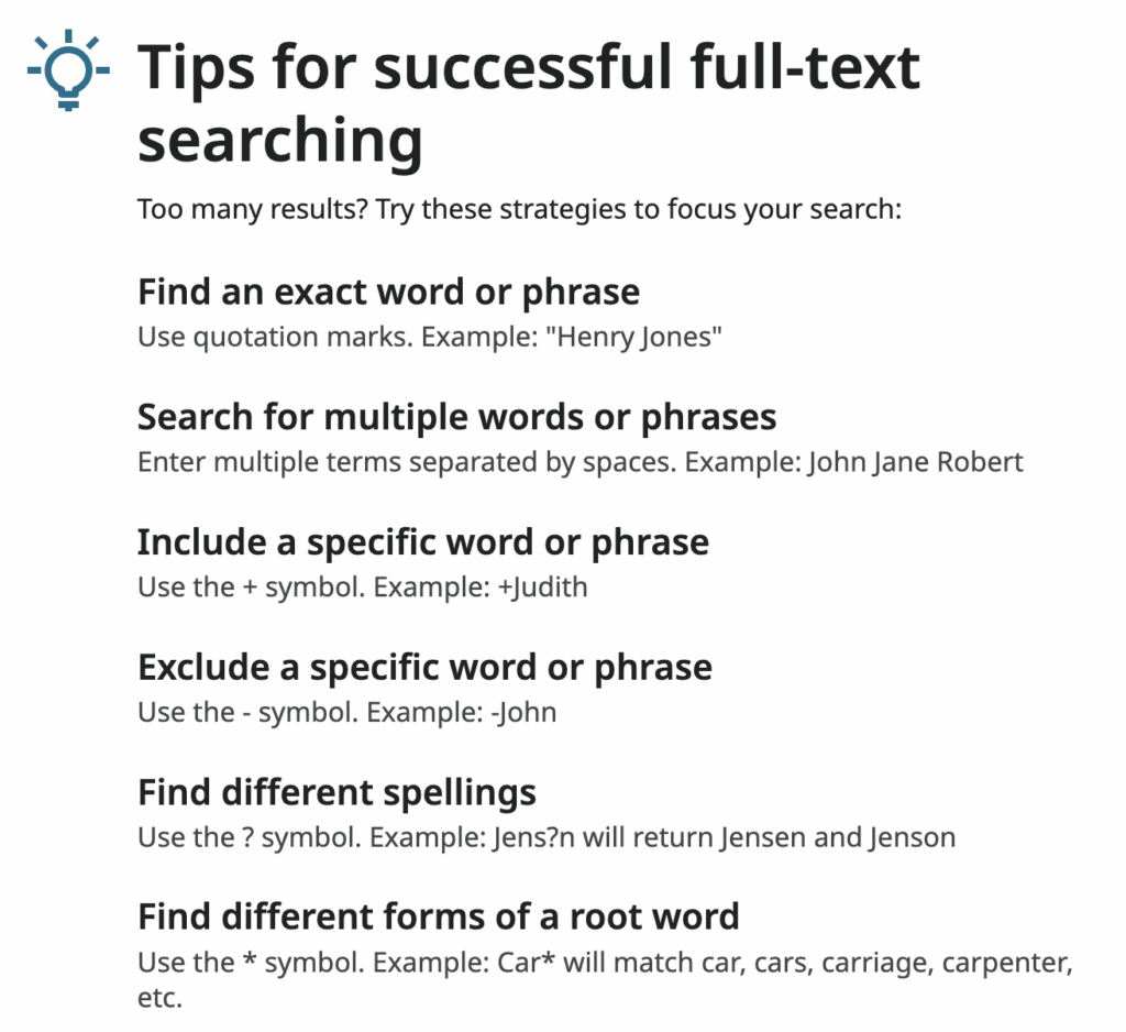 When using the Full Text feature it is important to know that occasionally typos will occur either do to human or computer error. By using different wildcard features you are able to search for what you are looking for and include various variants. A list below shows some of the different ways you can conduct a full text search via FamilySearch.